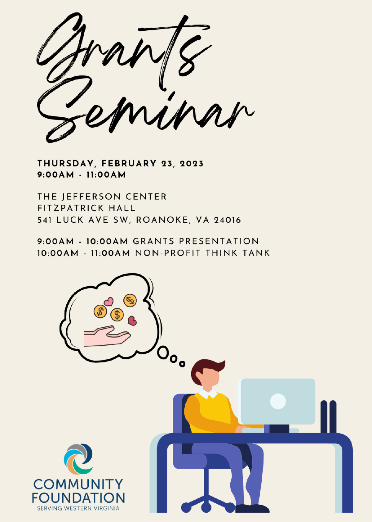 Join us for a Grants Seminar hosted by Community Foundation Serving Western Virginia! Bring your thinking caps because in addition to learning more about the Community Foundation’s grants, we will be hosting discussions on non-profit needs in our community!