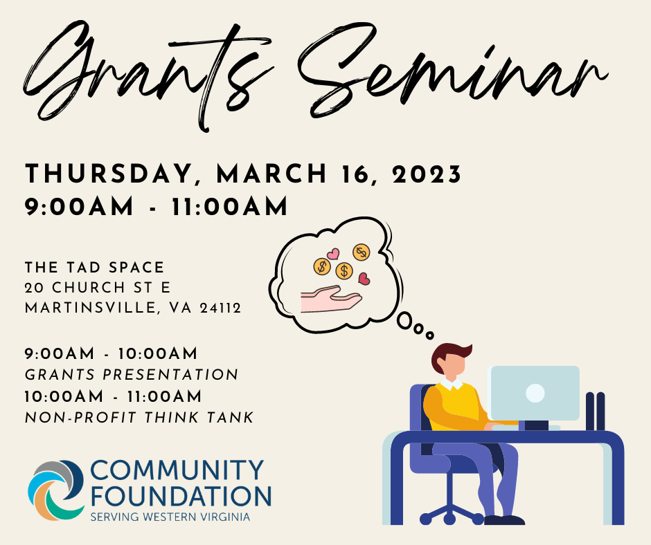 Join us for a Grants Seminar hosted by Community Foundation Serving Western Virginia! Bring your thinking caps because in addition to learning more about the Community Foundation’s grants, we will be hosting discussions on non-profit needs in our community!